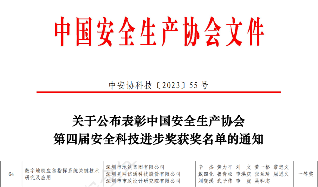 由深鐵集團牽頭,聯合深圳星網信通科技股份有限公司、深圳市市政設計研究院有限公司共同申報的《數字地鐵應急指揮系統關鍵技術研究及應用》項目,先后通過中國安全生產協會“第四屆安全科技進步獎”的形式審查、初評網評、評審會審、社會公示、申報預審、現場答辯、評審委員會終評等程序,榮獲“科技進步獎一等獎”。