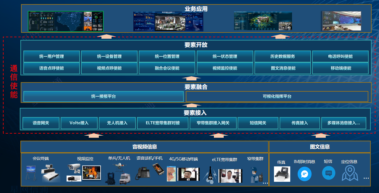 星網信通通信使能系統(tǒng)是連接通信平臺和業(yè)務系統(tǒng)的橋梁,提供強大的融合通信能力。南向支持接入無人機、執(zhí)法儀、智能眼鏡等音視頻終端到通信平臺;北向開放低代碼接口,提供統(tǒng)一用戶管理、統(tǒng)一設備管理、統(tǒng)一狀態(tài)管理、統(tǒng)一位置管理、統(tǒng)一API管理等能力,賦能上層業(yè)務應用系統(tǒng),快速實現(xiàn)將音視頻通信能力嵌入到業(yè)務流程,實現(xiàn)通信和業(yè)務融合,提升溝通協(xié)作效率。